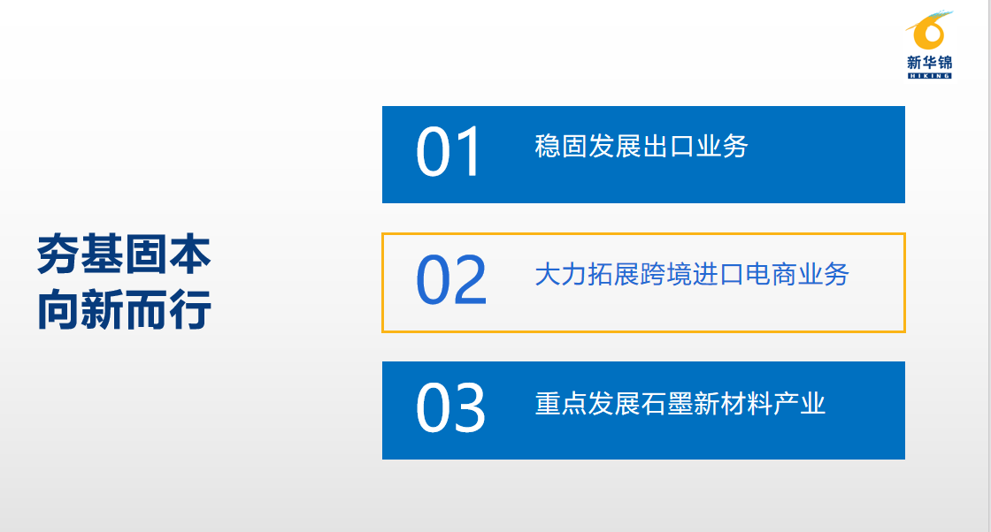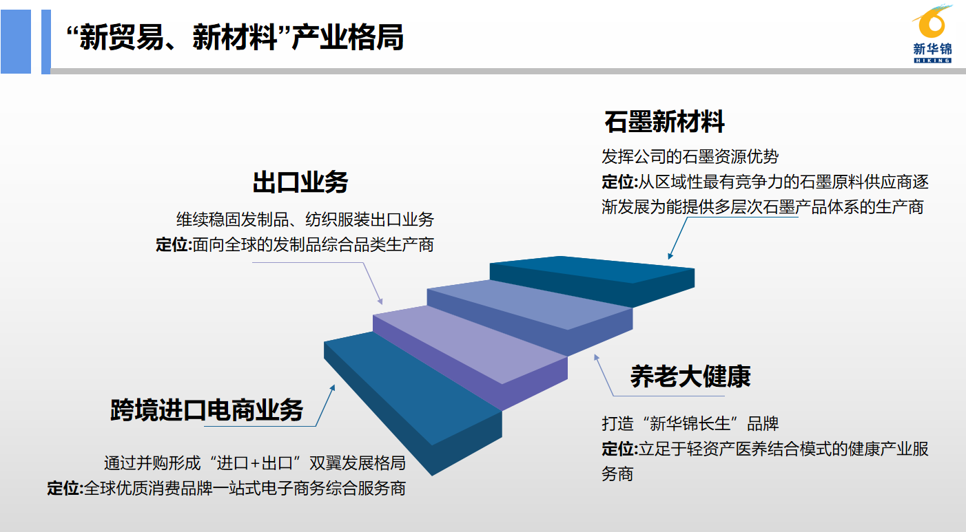 山東新華錦國際股份有限公司總部位于山東青島,是新華錦集團旗下A股上市公司。公司在國際貿易業(yè)務領域深耕多年,主營發(fā)制品和紡織品服裝產品的生產加工及業(yè)務出口業(yè)務,同時布局了石墨新材料產業(yè)和跨境進口電商業(yè)務,已逐步形成了“兩大核心戰(zhàn)略”“四個業(yè)務板塊”,初步建立了“新貿易、新材料”的產業(yè)格局。